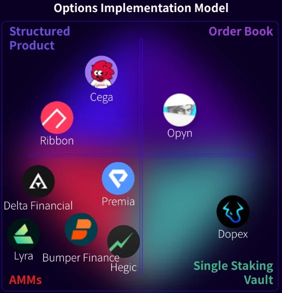 온체인 옵션 거래소는 표준화된 구현 모델이 없는데다 이를 규제할 기관 또한 존재하지 않습니다. 기준점과 제약이 없기 때문에 다수의 프로토콜이 다양한 구조를 표방하며 출시되었습니다. 각 프로토콜마다 상대방을 매칭하거나 옵션 가격을 책정하는 메커니즘이 구조상 가장 큰 차이를 갖는데, 자동화된 시장 조성자(Automated Market Maker, AMM) 모델부터 단일 스테이킹 옵션 볼트(Single Staking Option Vault, SSOV) 모델까지 구현 방식이 다양합니다.