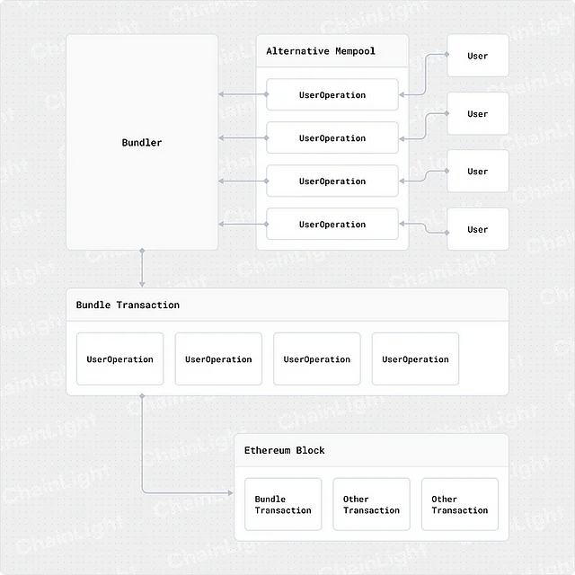 상기 그림은 ERC-4337을 통해 제출된 트랜잭션이 이더리움 네트워크에 도달하기까지의 과정을 대략적으로 보여줍니다.
