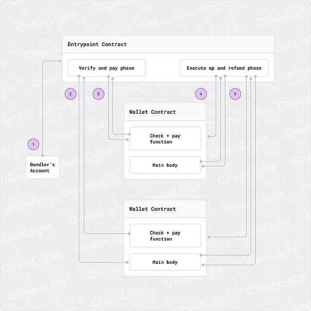 번들러는 묶음 트랜잭션의 제출을 위해 엔트리포인트(EntryPoint) 컨트랙트의 handleOps() 함수를 호출합니다. 이 함수에서는 내부적으로 UserOp이 유효한지 확인하고, UserOp을 제출한 계정으로부터 수수료를 받습니다. 검증 단계에서 계정이 수수료를 먼저 지불하기 때문에, 실행 단계가 실패하더라도 번들러는 수수료를 받을 수 있습니다. 검증이 끝난 묶음 트랜잭션은 엔트리포인트에 의해 실행됩니다.