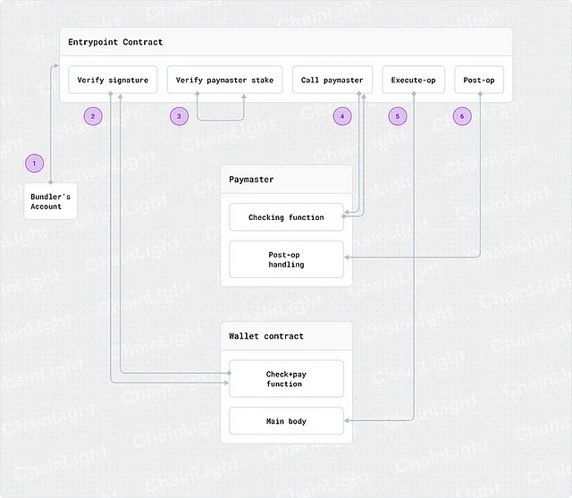 }페이마스터는 _requireFromEntryPoint() 함수를 통해 사전에 지정된 엔트리포인트만 호출할 수 있도록 합니다. 하기의 시나리오는 _requireFromEntryPoint() 함수의 호출 과정과 서명 검증 과정을 포함하고 있습니다.