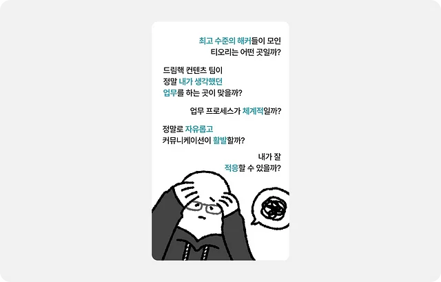 첫 출근을 앞두고 이런저런 생각이 들었어요. “최고 수준의 해커들이 모인 티오리는 어떤 곳일까?”, “정말 내가 생각했던 업무를 할 수 있을까?” 등… 걱정 반 기대 반으로 7월 1일 첫 발을 내디뎠습니다.