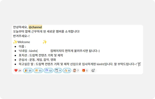 문서를 읽던 중, 메신져에 신규 입사자를 알리는 메시지가 올라왔어요. 많은 분들께서 이모티콘으로 환영해 주셨습니다 👍🏻 다양한 가이드라인과 문서를 읽으며 앞으로 일하게 될 티오리와 드림핵을 파악할 수 있었어요. 체계적으로 계획하며 업무할 수 있도록 도와주는 문서들 덕분에 출근하기 전의 걱정은 날릴 수 있었습니다.