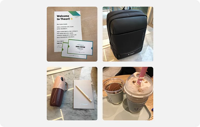 온보딩 동안 웰컴 키트를 받았습니다. 신규 입사자를 환영하는 대표님의 편지와 근처 카페에서 사용할 수 있는 커피 쿠폰이 있었어요. 저희 팀 리드님과 한 번, 비슷한 시기에 입사하신 컨설팅 팀원 분과 한 번 사용했습니다. 조금 더 유연하게 팀에 합류할 수 있는 시간을 가질 수 있어서 좋았어요.
