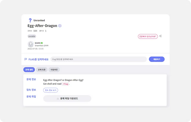 가장 첫 업무는 이곳에 wargame 문제를 업로드하는 것이었습니다. 문제를 만들고 업로드하는 프로세스를 파악하는 것이 목적이었어요. 저는 Pwnable 문제를 하나 만들어서 업로드했습니다.