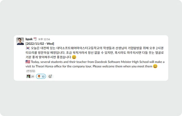 대덕소프트웨어마이스터고등학교(DSMHS)는 국가적 소프트웨어 인재 육성을 위한 한국 최초 소프트웨어 마이스터 고등학교예요. 입학 과정에 무려 코딩 테스트가 포함되어 있는 이 학교에서는 매년 뛰어난 학생들을 배출하고 있는데요, 그중 7명의 재학생들이 저희 회사를 방문했어요. 티오리도 기업탐방은 처음이라 (ft. 코로나19이슈😷) 더욱더 의미 있는 시간이었네요. 티오리 블로그와 함께 어떤 일정이 있었는지 한번 보시죠!
