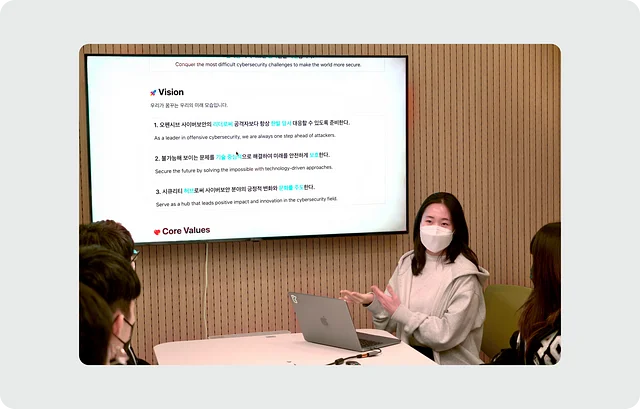 ONE 오펜시브 사이버 보안의 리더로서 공격자보다 항상 한발 앞서 대응할 수 있도록 준비한다. TWO 불가능해 보이는 문제를 기술 중심적으로 해결하여 미래를 안전하게 보호한다. THREE 시큐리티 허브로서 사이버 보안 분야의 긍정적 변화와 문화를 주도한다.