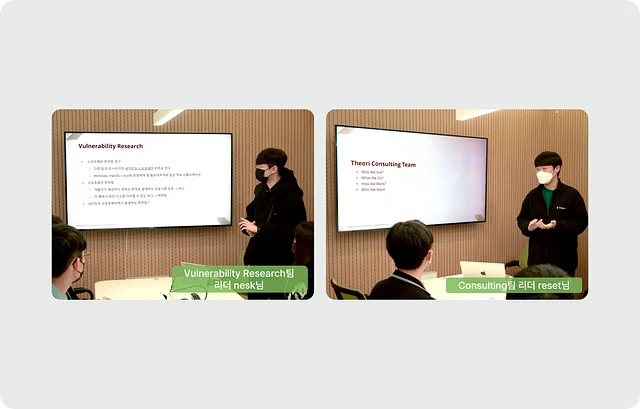 티오리의 첫 번째 비전 — 오펜시브 사이버 보안의 리더로서 공격자보다 항상 한발 앞서 대응할 수 있도록 준비한다 — 을 이끌어가는 취약점 연구 팀은 nesk 리더님이 소개해 주셨어요. 여러분은 버그와 취약점의 차이를 아시나요? 버그👾가 ‘프로그램의 의도와 다르게 실행되는 것’이라면 취약점은 ‘보안 사고로 이어질 수 있는 버그’라고 볼 수 있어요. 따라서 티오리 취약점 연구 팀은 악성 블랙햇 해커들보다 한 발 더 빠르게 새로운 취약점을 찾고 연구합니다!