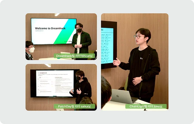 티오리의 세 번째 비전 — 시큐리티 허브로서 사이버 보안 분야의 긍정적 변화와 문화를 주도한다 — 을 만들어 가는 팀은 Dreamhack와 PatchDay입니다! 감사하게도 기업탐방에 참여한 모든 학생들이 Dreamhack을 알고 있었는데요, 드림핵은 해커들의 놀이터, 티오리의 사이버 보안 교육 플랫폼이에요. 드림핵에는 교육 강의뿐만 아니라 워게임, CTF, 커뮤니티 포럼 등 다양한 서비스가 제공된다고 팀 리드 bincat님이 자세히 설명해 주셨어요. 이 모든 것을 통해 더욱 안전한 사회를 만드는 것이 드림핵 팀의 목표랍니다!